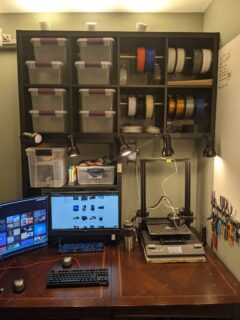 Beyond just the lighting, the biggest improvement was replacing the 4×4 cube array with a 2×4 (across the top), and a 2×2 (with the middle partitions removed- at the lower left.) This left the 2×2 area on the right open for the 3D printer.