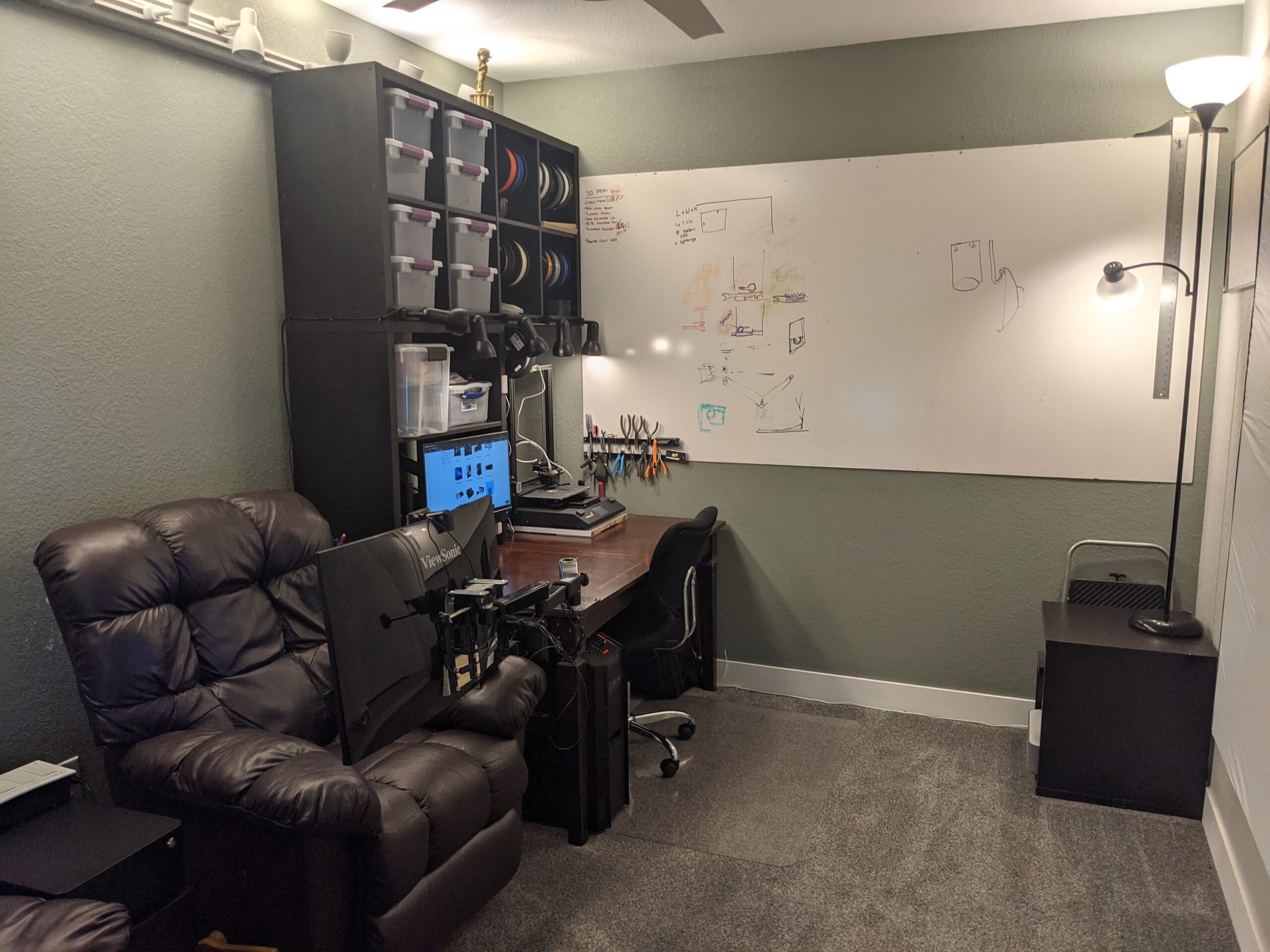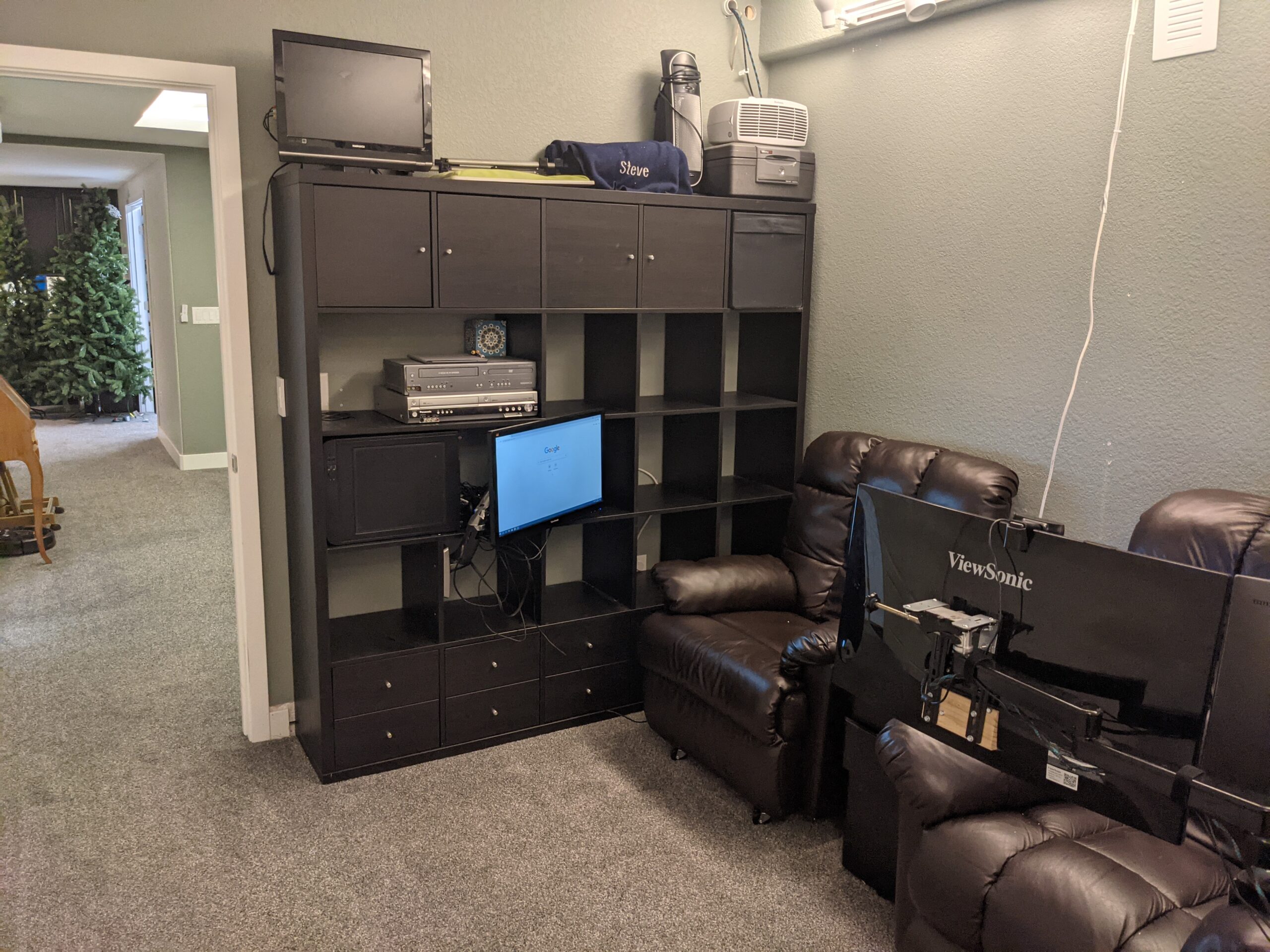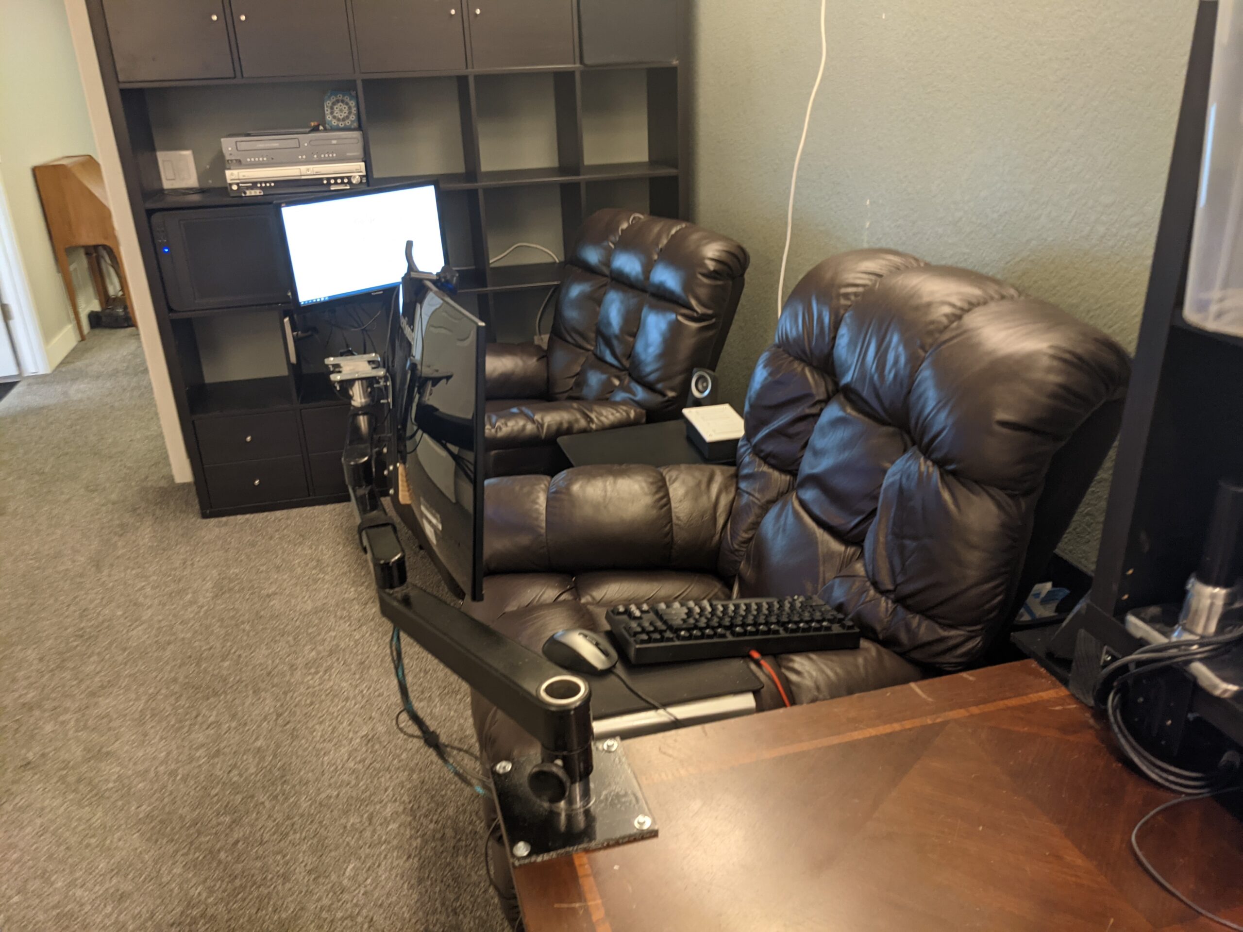 The other big improvement was reworking the monitor arm and computer systems. As you’ll see in the pics below, my two monitors (the 32″ curved 2560×1440 and the 24″ 1920×1080) can now be positioned for use on the desk, or from my chair, or one of each, so I can use the Megabox from either place. There’s also a small PC on the shelf behind the monitor, which can be used with the 24″ display from here, and from my “co-pilot” chair, with a separate (mirrored) display, and keyboard+mouse.