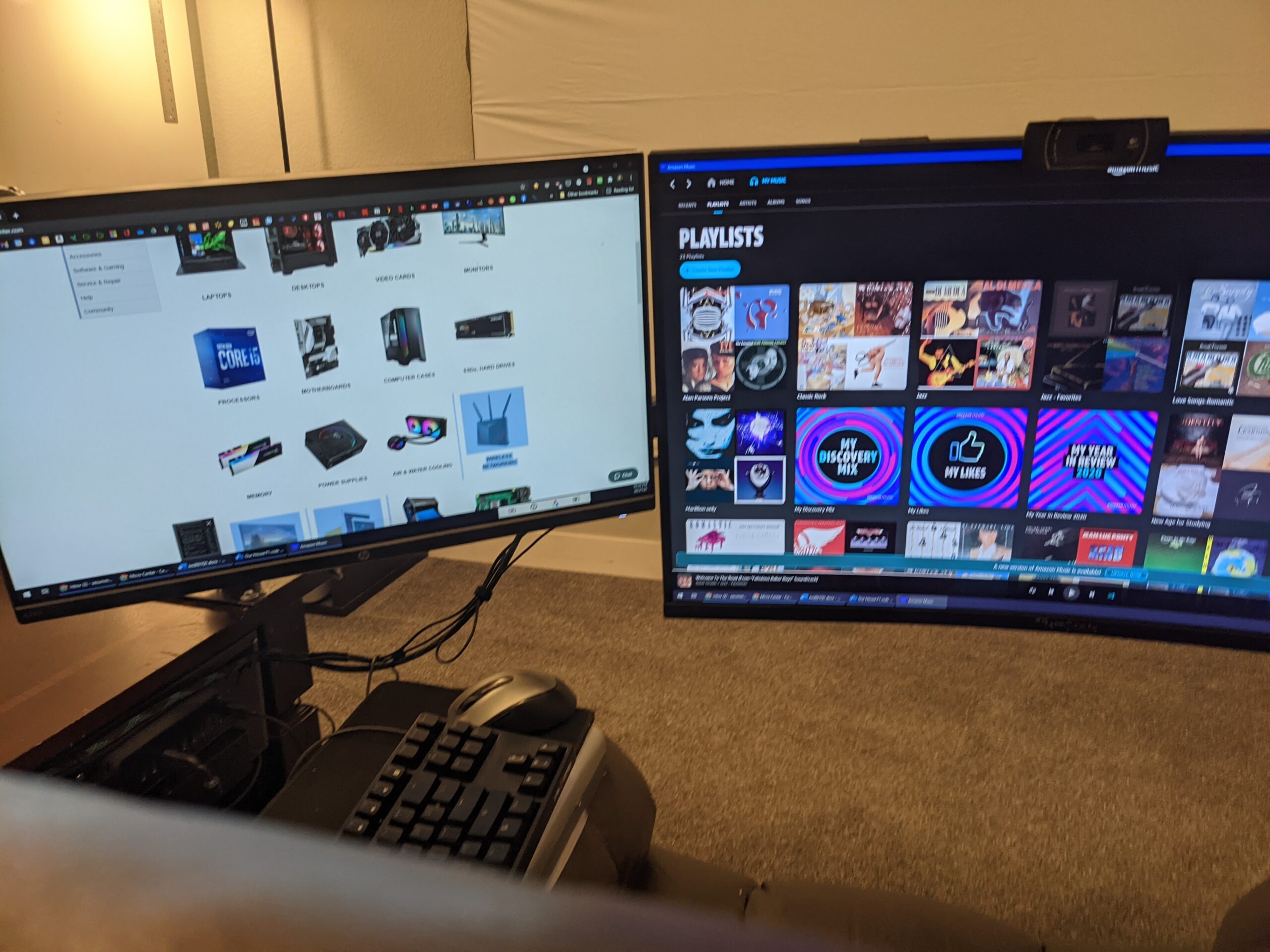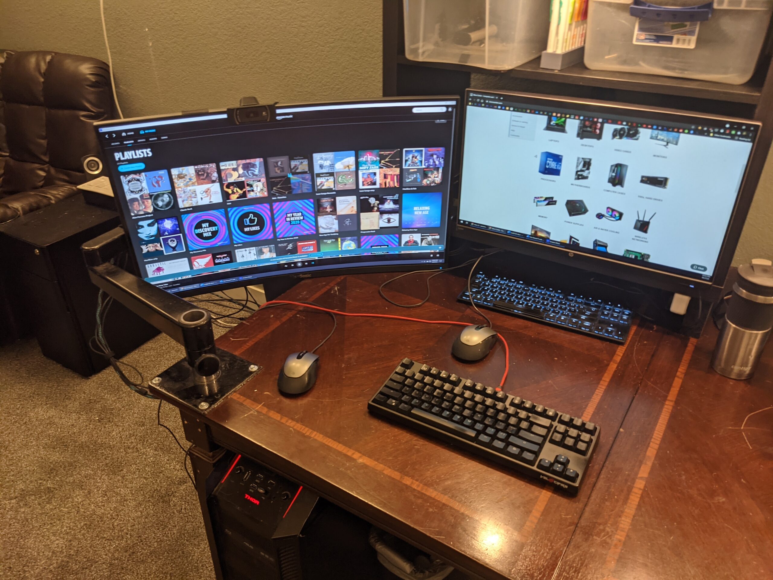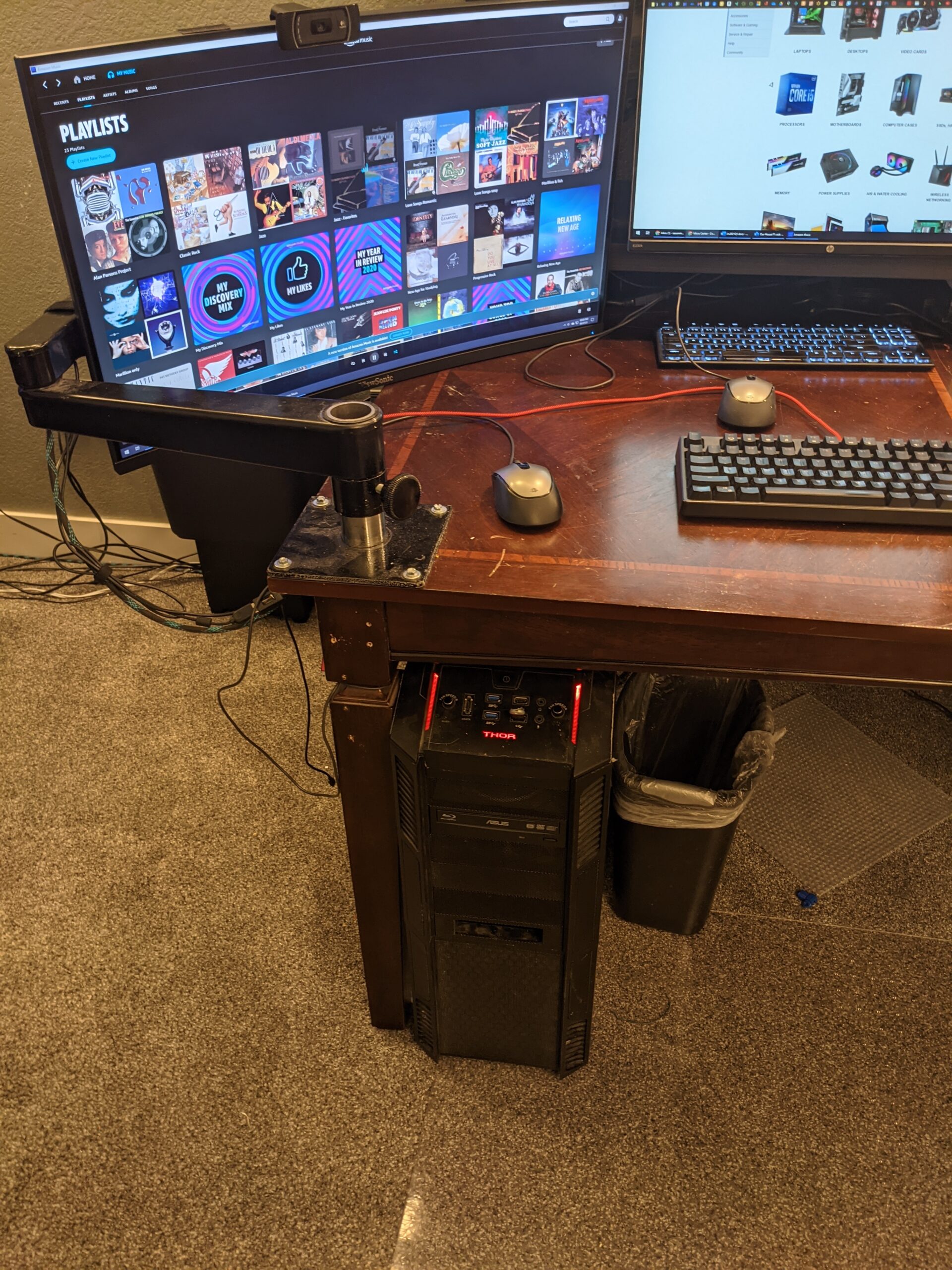 The other big improvement was reworking the monitor arm and computer systems. As you’ll see in the pics below, my two monitors (the 32″ curved 2560×1440 and the 24″ 1920×1080) can now be positioned for use on the desk, or from my chair, or one of each, so I can use the Megabox from either place. There’s also a small PC on the shelf behind the monitor, which can be used with the 24″ display from here, and from my “co-pilot” chair, with a separate (mirrored) display, and keyboard+mouse.