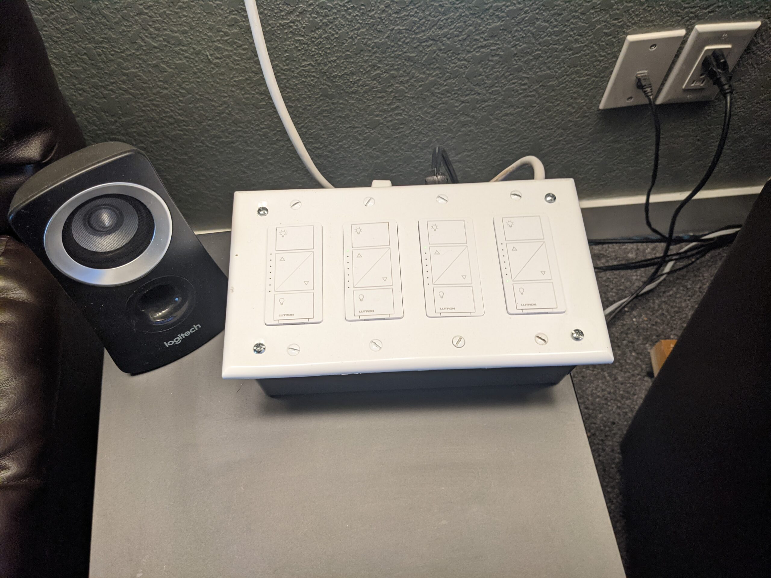 These (and the pole lamp across the room) are controlled by four Lutron Caseta dimmers – for the reading lights, the room lights, the pole lamp (also room lighting), and the desk’s lights on the right. These are also wirelessly controlled by my Hubitat system, and by a couple Pico remotes (the little white rectangle in the middle of the picture on the left.)